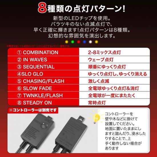 ・コントローラーは別売です。 常点灯電源コード付きタイプです。点滅やパターン制御には別売コントローラーをご使用ください。