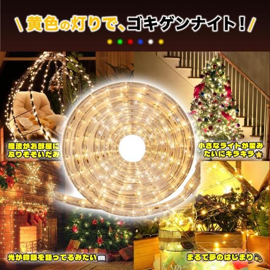 LEDチューブライト 防雨型電源付 ロープライト 2芯タイプ 10m 直径10mm 300球 連結可能 カット可 【イエロー・黄色】