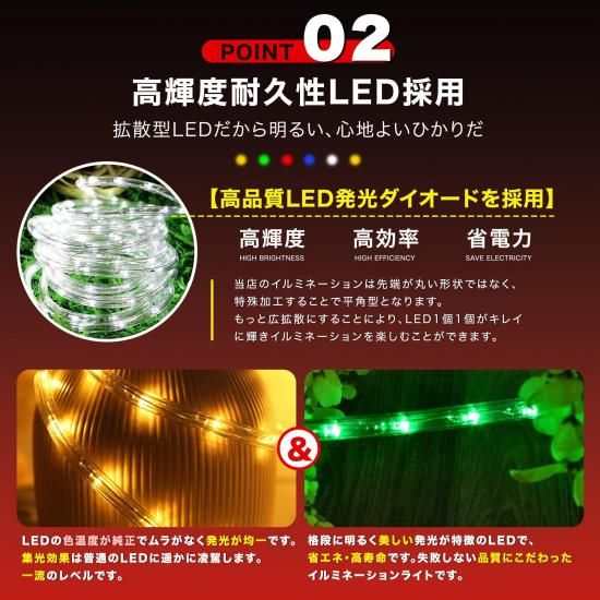 LEDチューブライト 防雨型電源付 ロープライト 2芯タイプ 10m 直径10mm 300球 連結可能 カット可 カラー 4色ミックス