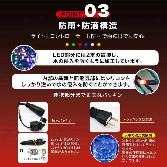 室内外で使える防水設計。電源を抜いても前回のパターンを記憶するメモリー機能付き。