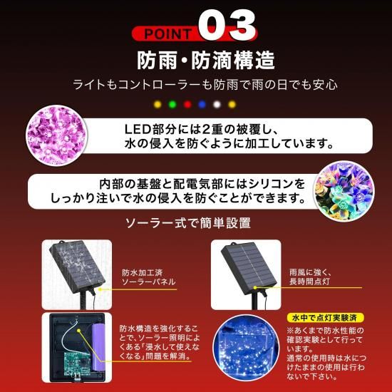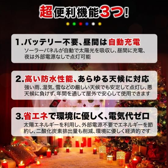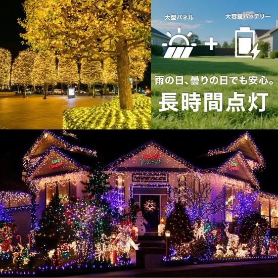 イルミネーション ソーラー LED 200球 20m 全7色 8パターン クリスマスライト ソーラーイルミネーション ソーラーライト 充電式 ソーラーLED 大型ソーラーパネル 大容量バッテリー ソーラー充電 太陽光 太陽パネル 夜間自動点灯 ストレート 飾り ライト 電飾 看板点灯 街灯 庭園灯 ガーデンライト カーテンライト ツラライルミネーション アイシクルライト ジュエリーライト ledライト コントローラ付 コンセント式 防雨 連結可 高輝度 長寿命 高品質 記憶 メモリー機能 おしゃれ 屈曲性 柔軟性 複数連結 防犯 対策 照明 エコ 省エネ 節電 保証付 クリスマス ツリー ハロウィン お祭り 結婚式 誕生日 新年 お正月 学園祭 イベント キャンプ 庭 パーティー 玄関 柱 フェンス バルコニー ベランダ 屋根 壁面 軒下 窓 花壇 階段 手すり ショーウィンドー ガーデニング 家 屋外 室外 植木 職場 自宅 部屋 店舗 野外 学校 幼稚園 商店街 ギフト 屋内屋外兼用 100本耐候性ロックタイをプレゼント 送料無料 おすすめ 業務用