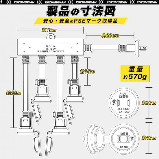 1つの電源から4方向に分配。イルミネーション、投光器、電動工具など、複数の同時使用に最適です。