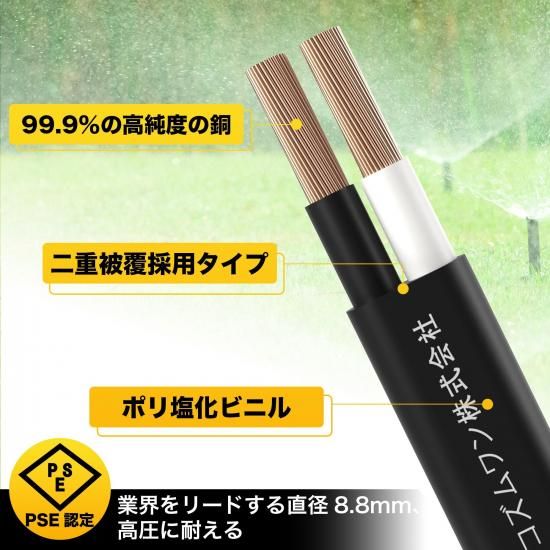二重被覆の工業級VCT電線を採用。踏みつけや摩耗に強く、寒冷地でも硬くなりにくい柔軟な素材です。